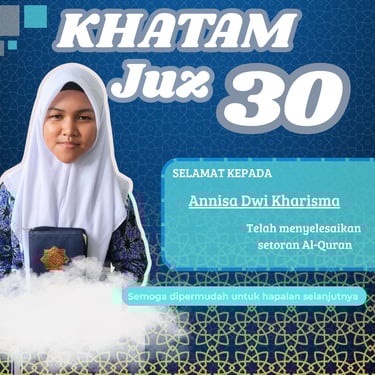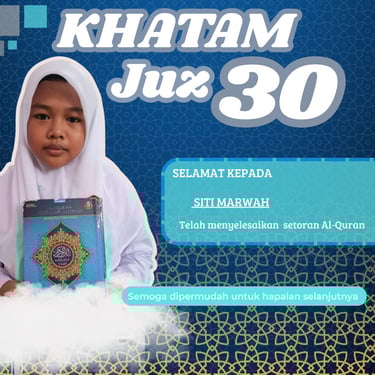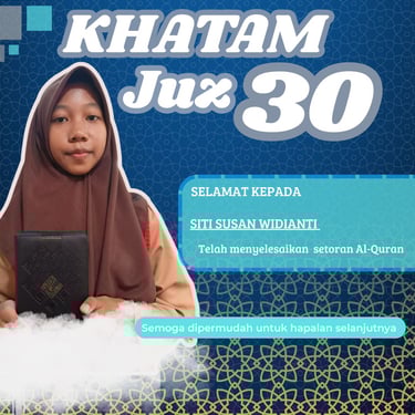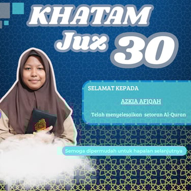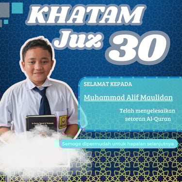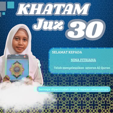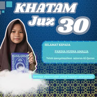 Alhamdulillahirabbil ‘alamin, puji syukur kita panjatkan ke hadirat Allah SWT yang telah memberikan kemudahan dan kekuatan kepada para peserta didik hingga berhasil menyelesaikan setoran hafalan Juz 30. Pencapaian ini bukanlah hal yang mudah, tetapi hasil dari ketekunan, kesabaran, dan semangat belajar yang luar biasa. Semoga hafalan yang telah dicapai menjadi cahaya dalam kehidupan, penuntun dalam setiap langkah, dan pemberat amal kebaikan di akhirat kelak. Teruslah menjaga dan mengulang hafalan agar selalu melekat di hati. Semoga keberhasilan ini menjadi awal dari perjalanan menghafal Al-Qur’an yang lebih luas dan penuh keberkahan.